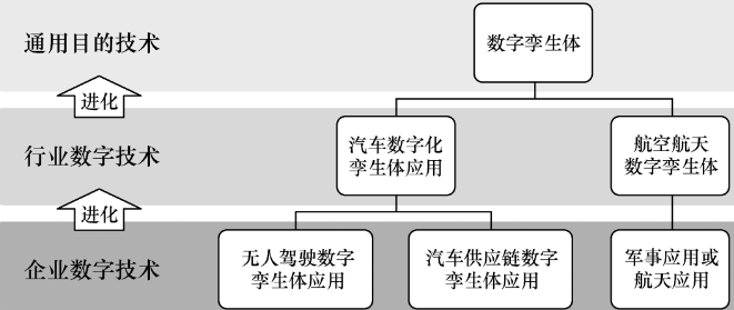 通用目的技术在某个具体领域产生,抽象出共性技术,然后把该技术应用到要求较低的领域,不断降低该技术的应用成本,从而形成一个相辅相成的创新闭环。数字孪生体作为新一代通用目的技术,也将遵循类似的规律。通用目的技术演进过程如下图所示。