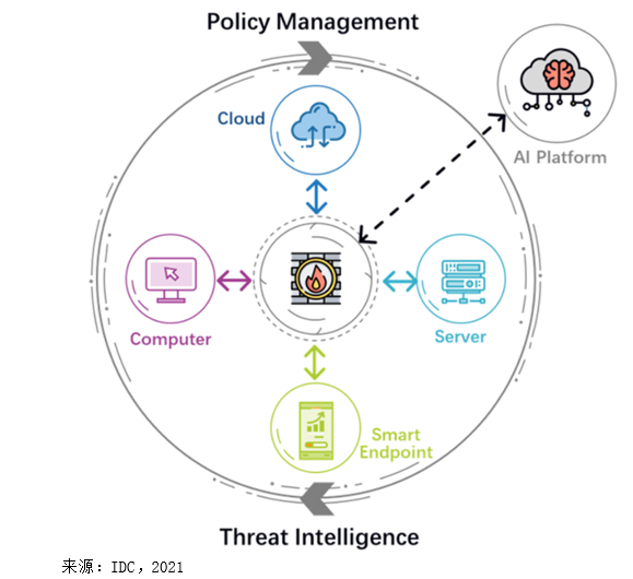 IDC认为,融入AI技术的新一代防火墙整体防御思路已经发生了巨大变化,由原先的“单兵防守”变为与多方“联合防御”。AI平台的持续训练确保新一代防火墙具备最新的AI检测模型,未来AI平台将形成远程与本地化部署相结合的模式,确保AI训练以客户真实的应用场景为基础,最终训练出更为有效的AI检测模型。而新一代防火墙同时也会结合威胁情报、策略管理、EDR等外部的安全组件,对网络攻击进行更为高效精准的识别与阻断。如下图所示: