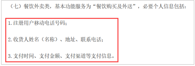 (七)餐饮外卖类,基本功能服务为“餐饮购买及外送”,必要个人信息包括: