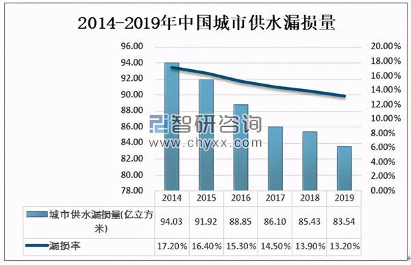 根据住建部发布的《城镇供水管网漏损控制及评定标准》(CJJ92-2016)中规定,漏损率按两级评定,一级为10%,二级为12%。但由于大部分城市供水漏损率仍较高,因此预计2019年城市管网漏损率高于12%,约为13.2%,2019年城市供水漏损量约为83.54方米。