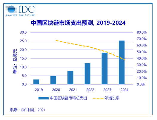 IDC于3月24号发布了《2021年V1全球区块链支出指南》(IDC Worldwide Blockchain Spending Guide),从技术、行业、应用场景等多个视角发掘未来五年全球区块链市场中的潜在机会,同时总结了过去一年的市场发展情况。IDC预测,2024年全球区块链市场将达到189.5亿美元,五年预测期内(2020-2024)实现约48.0%的复合增长率。