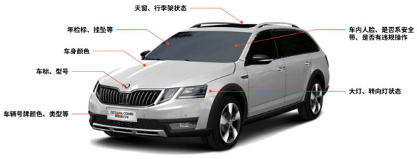 车辆结构化除了对车辆的品牌型号、车身颜色、号牌、年检标等固有特征进行标识,也可对驾驶员的人脸以及是否系安全带、是否打手机等驾驶状态进行结构化描述。