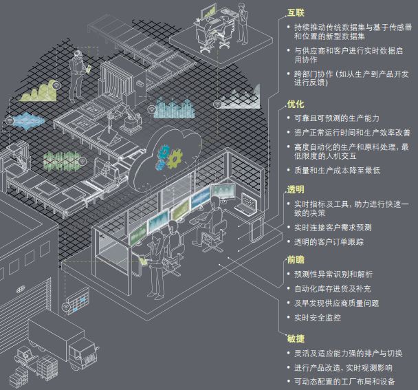 上图描述了智能工厂及其部分主要特征:互联、优化、透明、前瞻和敏捷.