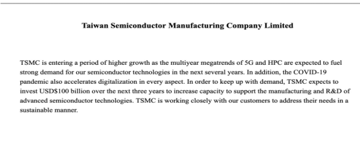 在这种情况下,芯片大厂相继选择了扩产,以应对产能紧缺的困局。几个月前,台积电宣布将于2021年投入280亿美元的资本开支,希望通过建厂来扩大芯片产能。然而,近期愈演愈烈且无丝毫消退迹象的芯片供应危机,已经迫使台积电在产能投资上进一步加码。