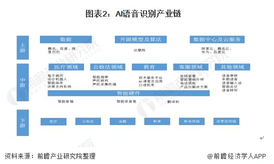 中国AI语音识别市场参与者众多,主要分为上游、中游、下游。