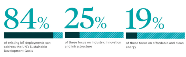 更进一步的分析显示,绝大多数的物联网项目都与碳中和的目标一致。84%的物联网项目可以满足全球性的可持续发展,在这些项目中,25%关注于工业和基础设施创新,19%聚焦于提供价格合理的清洁能源。