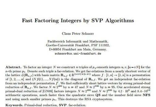 据悉,这份论文名为《通过SVP算法快速分解整数》,作者Claus Schnorr,现年77岁,于2011年从约翰·沃尔夫冈·歌德大学退休。他是一位受人尊敬的密码学家,Schnorr签名算法便是以他的名字命名。在密码学中,Schnorr签名是由Schnorr签名算法产生的数字签名,它是一种数字签名方案,以其简单高效著称,其安全性基于某些离散对数问题的难处理性。由于Schnorr签名算法可以构建更高效和隐私性更强的区块链系统,一直备受区块链开发者们的关注。