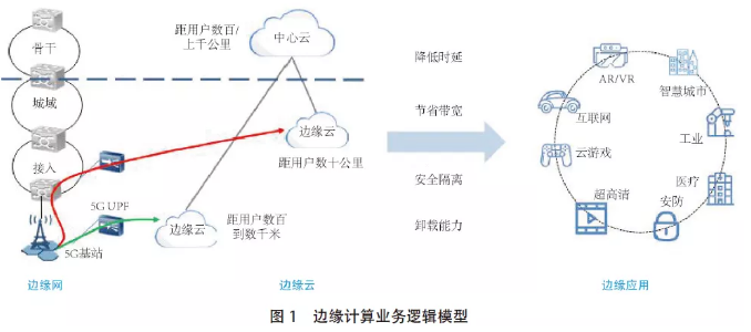 ISO[2]定义边缘计算为“将数据和任务在靠近数据源头的网络边缘侧进行计算和执行的一种新型服务模型”。欧洲电信标准化协会(ETSI)[3]认为“边缘计算是为应用开发者和内容提供商提供在(运营商)网络边缘侧的云计算能力和IT服务,这一环境的特点是极低的延时和极大的带宽,支持针对应用侧无线网络的实时访问”。目前,业界普遍认为“边缘计算借助边缘网络将云计算能力下沉至边缘节点,边缘节点的算力和存储资源与分布式的云计算技术结合,为车联网、云游戏、超高清视频直播等边缘应用提供高效能力支撑”[4]。