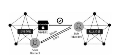 比如,Alice是比特用户,持有3个比特币;Bob是以太用户,持有100个以太币;咖啡店C支持比特币支付,且一杯咖啡的售价为1个比特币,但不支持以太币支付。Bob通过跨链机制(比特币、以太币之间的跨链机制)从Alice手里兑换到一定比例的比特币,再使用比特币从咖啡店C买到了想要的咖啡,最终完成了使用自己持有的以太币从咖啡店购买一杯咖啡的交易。