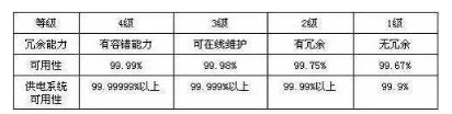 美国TIA 942标准与Uptime Institute的定义,将数据中心的可用性等级分为四级,如下表所示: