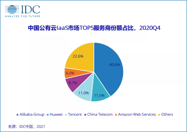而其它云巨头之间的差距也悬殊巨大。通过IDC发布的《中国公有云服务市场(2020第四季度)跟踪》报告显示:2020年第四季度中国IaaS市场规模为34.9亿美元。华为与腾讯份额均为11%,并列第二,根据份额计算公有云IaaS服务营收规模为3.84亿美元(24.45亿元人民币)。而阿里云40.6%份额为14.17亿美元(人民币超90亿元)。
