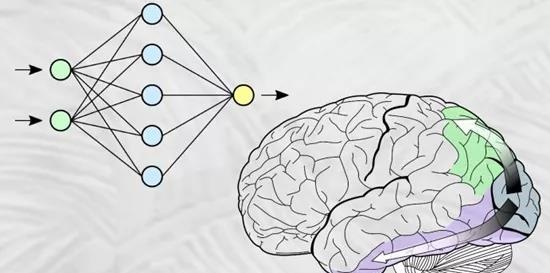 在视觉皮层(右)中,信息会沿多个方向移动。但在神经网络(左)中,信息只沿单一方向移动。
