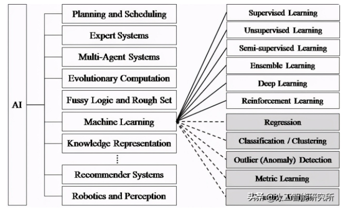 人工智能技术希望使用计算机来构造复杂的、拥有与人类智慧同样本质特性的机器,这些能够代替人工工作的机器,算法等等统一称之为人工智能,人工智能是一个很大的范畴,随着计算机技术的不断发展,人工智能的研究领域也在不断扩大,下图展示了人工智能研究的各个分支,包括专家系统、机器学习、进化计算、模糊逻辑、计算机视觉、自然语言处理、推荐系统等。