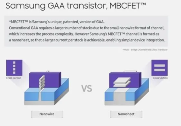 三星采用的下一代工艺技术——GAA全称为环绕栅极晶体管。通过使用纳米片设备制造出了MBCFET(Multi-Bridge-Channel FET,多桥-通道场效应管),该技术可以显著增强晶体管性能,主要用来取代FinFET晶体管技术。