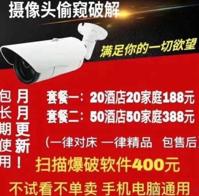 有些不法分子利用产品的技术漏洞破解了大量摄像头IP地址,高价售卖破解软件与“偷窥套餐”,他们通过较为隐蔽的方式出售已经被破解的摄像头ID和破解软件。例如,在QQ上,他们以“摄像头”为用户名吸引客户,列出“价目表”,包括168元、238元的“家庭套餐”以及收费更高的“酒店套餐”和大学附近酒店,破解摄像头ID数量在12个至15个之间。