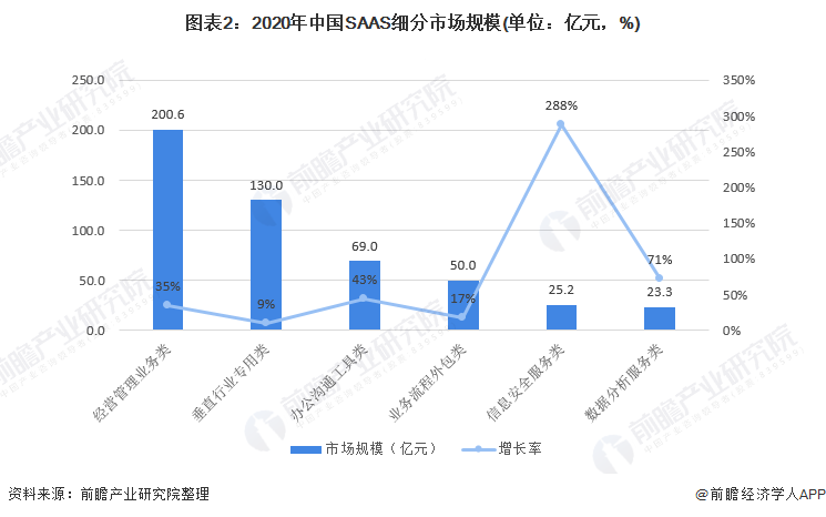 从中国SaaS细分市场规模来看,经营管理类SaaS市场份额最高,占比为40%,规模达到200.6亿元,其次为垂直行业应用类市场份额为26%,规模也达到130亿,办公沟通工具类占比为14%,市场规模也达到69亿元。
