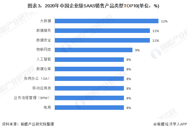 从SAAS厂商的实际销售的产品类型分类来看,大数据、数据安全、数据服务和物联网是销售较多的产品类型。