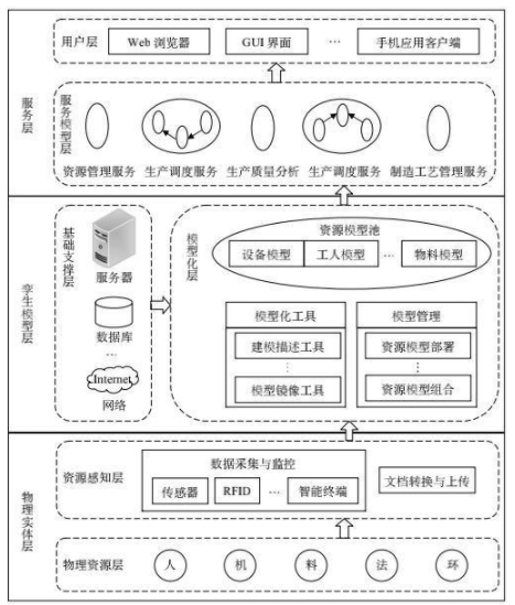 物理实体层是制造车间的主体,主要包括人、机、料、法、环五个大类。人指制造产品的人员,包括操作工人、维修工人等;机指制造产品所用的设备、工装等辅助生产用具;料指制造产品所使用的物料,包括半成品、原料等用料;法指制造产品所使用的方法,包括工艺指导书、标准工序指引、生产计划表、检验标准、各种操作规程等;环指产品制造过程中所处的环境,包括各种设备的布局,温度、湿度、噪音等要求。
