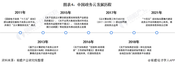 2011年12月,《国家电子政务“十二五”规划》首次提出建设完善电子政务公共平台,并推行“云计算服务优先”模式,推动政务部门业务应用系统向云计算服务模式的电子政务公共平台迁移,正式开启中国政务云发展的大门。