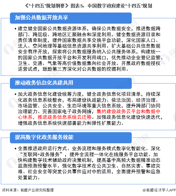 2021年3月,“十四五”规划提出要提高数字政府建设水平,包括加强公共数据开放共享、推动政务信息化共建共用、提高数字化政务服务效能三大内容。要求“十四五”期间完善国家电子政务网络,集约建设政务云平台和数据中心体系,推进政务信息系统云迁移。随着国家数字政府的建设推进,中国政府云计算行业将不断发展壮大。