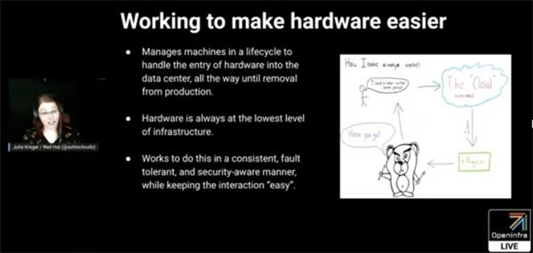 红帽高级首席软件工程师Julia Kreger首先介绍了OpenStack Ironic。Ironic是一个开源项目,它提供了一个框架来管理裸金属的生命周期。它允许用户以自动化的方式安全地重新部署和重新使用裸金属,而无需前往数据中心。