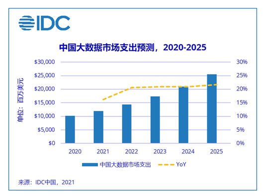 在全球疫情下,中国经济率先复苏并总体保持恢复态势。今年是中国政府实施“十四五”规划的第一年,围绕新一代信息技术等战略性新兴产业的投资增速进一步提升。IDC预测,中国大数据市场2021年整体规模超110亿美元,且有望在2025年超过250亿美元,呈现出强劲的增长态势。在五年预测期内,中国终端用户对大数据硬件、软件、服务的支出分布相对平均——与美国等区域不同,中国大数据市场的软件订阅制服务占比较低,本地部署及私有云模式仍需要采购大量硬件设备。至2025年,硬件预计将吸收中国大数据市场约40%的投资规模,超过软件和服务,增长稳定;大数据软件市场占比将逐年提升,2025年超30%的市场支出将流向软件,五年CAGR达到26.7%。