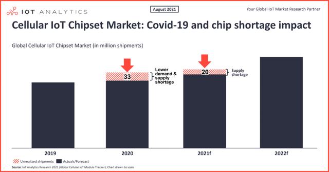 根据IoT Analytics的数据,2020年全年蜂窝物联网芯片的缺口达到了3300万片,这源于供给和需求两方面的因素。2020年初,新冠肺炎对全球生产造成了很大负面影响,由于各行各业生产有可能随时停滞,企业的供应链和获得原材料的渠道也不完整,很多企业冻结了采购预算,这些不确定性导致芯片需求明显下降。2020年下半年,随着疫情的初步稳定,各行业的需求开始恢复,然而供给侧却经常中断,导致全球芯片供应短缺,首先是汽车行业,然后向着其他行业扩展。2020年全年蜂窝物联网芯片出货量增速仅为3%。