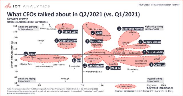 IoT Analytics对美国2500家上市公司CEO的财报电话会议关键词进行统计分析,用以研究企业管理者的关注要点,分析显示,2021年第二季度,上市公司CEO们谈论的最热门中,芯片短缺排名第二,芯片短缺被27%的企业提及,比第一季度增长了155%,可见芯片短缺影响面非常广。