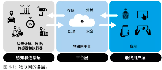 图1-1总结了这些变化。在感知和连接层,该平台将物联网硬件连接到执行数据处理和存储的网络应用。中间是平台层,用于存储、保护、处理和分析数据。在最终用户层,它连接至最终用户应用,通过这些应用监控并解读来自物联网设备的数据,并发送指令,要求设备执行诸如锁好前门或打开车库门等操作。