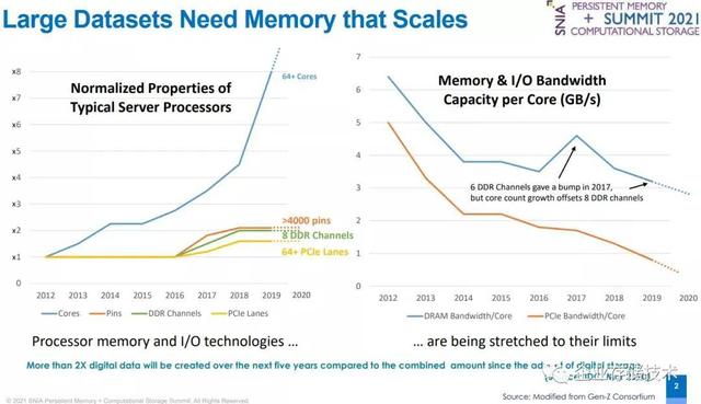 但事实情况是,根据企业存储技术发布的一篇文章显示,在2021 Persistent Memory+Computational Storage Summit会议中主题为《Futureof Persistent Memory,DRAM and SSD Form Factors Aligned with New SystemArchitectures》的演讲中曾指出,从2012-2019年,服务器CPU核心(从8核到64核)增长了8倍,而Pin引脚数量(从LGA-2011到4094/4189)和内存通道数(从4到8)仅增长了2倍,PCIe lane(从40到64,如果是AMD则按照双路中每CPU支持来算)甚至不到2倍。也就是说I/O跟不上计算密度的增长。