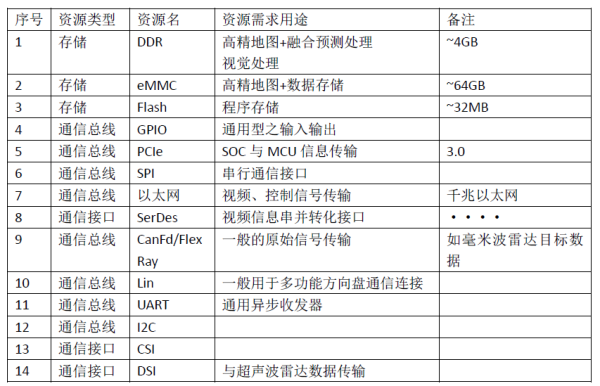如下表表示了高阶自动驾驶中央域控制器单元中的除AI计算单元SOC及逻辑计算单元MCU以外的所有典型网络连接、存储及接口信息交换单元数据信息。