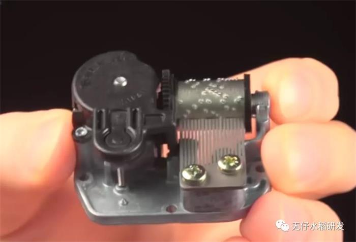 你能看到上面一个个斑斑点点,它的作用就是流动的音符,通过预设的音符刻在滚筒上,弹簧片在滚筒滚动时摩擦上面的凸起处发出声音。所以你可以把滚筒理解为一段音符的存储器皿。就这么个小小的零件,当你上满发条之后就能播放一段美丽的音乐。