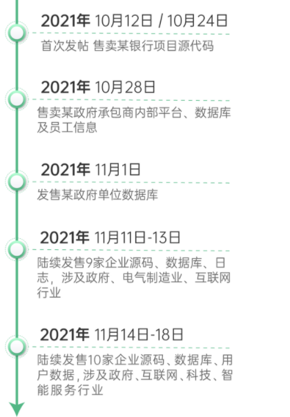 2021年10月,ATW黑客团伙在境外论坛第一次出售我国单位相关系统的源代码,并称能直接访问到内部系统。随后该黑客组织又陆续发布我国多家重要单位的系统源代码、用户数据、数据库,我们追踪ATW活跃记录,整理出以下时间轴:
