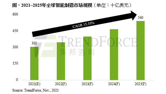 根据TrendForce集邦咨询表示,元宇宙概念得以满足远端作业、虚拟实境、模拟运作等陆续崛起的市场需求,而智能制造亦有望乘此热潮,催动相关技术加速开发,推升全球市场规模于2025年一举突破5400亿美元,2021至2025年复合成长率达15.35%。