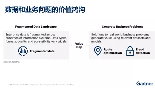 为什么会出现这种现象?Gartner研究总监孙鑫一语道破!在他看来,企业已有的数据投入是割裂状态,有严重的数据孤岛问题。虽然,企业在后端已经部署了大量与数据管理相关的应用,但与前端数据消费者以及与应用之间存在着巨大的价值鸿沟。