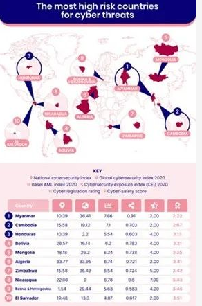 在SEON的全球网络安全指数中,缅甸的互联网安全排名较差,仅得分2.22,该国的整体得分很低,尤其是在立法方面,几乎没有制定任何措施来惩治网络犯罪分子。虽然,网络安全立法是排名的主要考虑因素,不过,空有立法也无用,良好的监管环境才能助力网络安全走得更远。例如,即使一个国家已经通过或正在通过有关消费者隐私或数字安全的立法,但是如果缺乏监管——无论是针对实施这些罪行的罪犯,还是针对拒绝投资合规的企业,或者针对那些故意无视隐私和安全法规的人等,又有什么用呢?