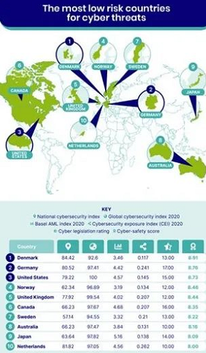 日前,欺诈检测软件公司SEON通过收集国家网络安全指数(NCSI,根据每个国家的网络安全措施强度对其进行排名)、2020年全球网络安全指数(根据各国的网络安全实践对其进行排名)、巴塞尔反洗钱指数第9版(根据洗钱和恐怖主义融资风险对国家进行排名),以及2020年网络安全暴露指数(CEI,衡量每个国家/地区的互联网用户面临的风险)等数据,得出了网络犯罪风险较低和较高国家的全球排名。