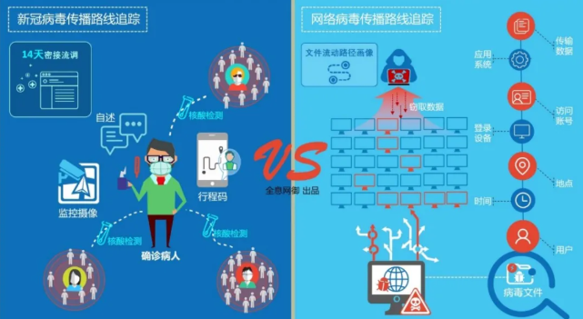 新冠病毒追踪的最大特点是病人可以自述密接经历,而网络病毒的载体无法做到这一点,只能依靠技术手段对携带病毒的文件追踪溯源——从时间序列来重现病毒文件的传播路线,即网络中第一次发现这个文件的时间、地点、传送或接受文件的设备、来源或去处(应用系统或服务),以及此后所有对该文件操作的传输设备、接收的客户端或服务器等,形成一个完整的文件流动路径图,对其进行精准画像。