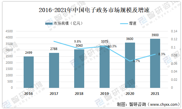 其中中国电子政务市场规模逐年增加,2021年中国电子政务市场规模为3900亿元,同比增长8.3%。