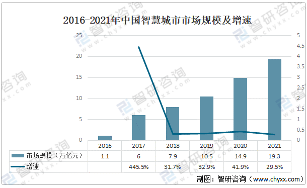 2016-2021年中国智慧城市市场规模及增速