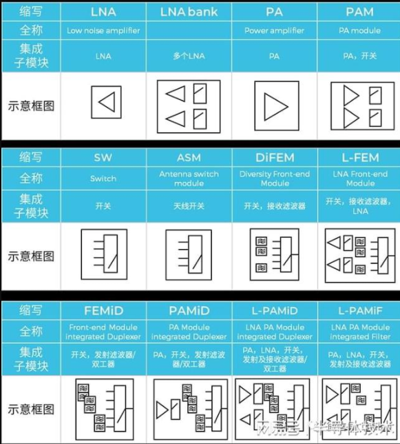 根据模组内集成器件的不同,射频前端模组也有不同的名称。常见的模组名称及集成的器件如下表所示。