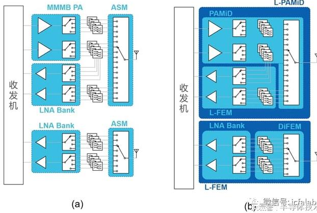 图:分立方案(a)与模组方案(b)实现的射频前端系统