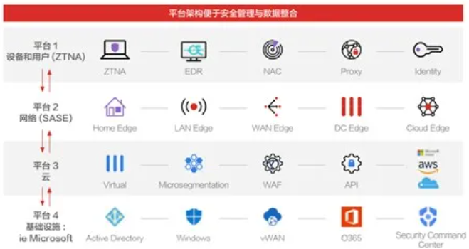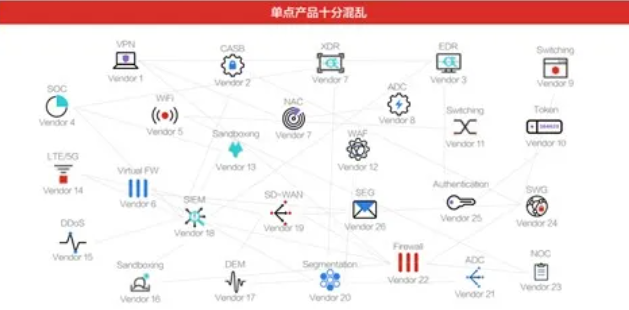 据Gartner调查显示,78%的受访企业使用16种以上的单点安全产品,12%的受访企业使用46种以上的单点安全产品。这标志着大多数企业使用的都是松散、割裂的单点安全解决方案。同时,企业使用的各种单点安全产品又通常都是孤立运行,这导致网络运营团队和安全运营团队无法获得整个企业数据流量的可见性。
