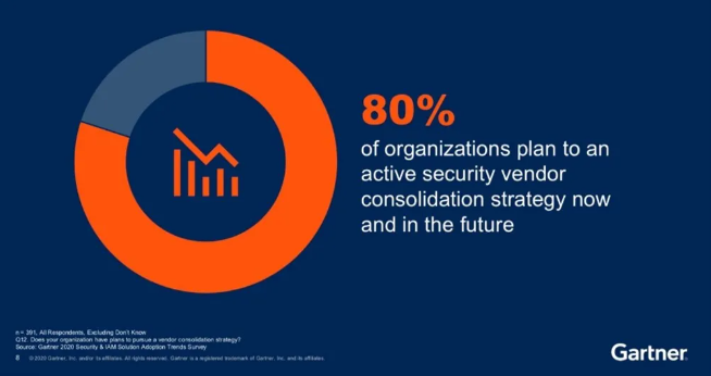 据Gartner预测,大多数企业和机构已经认识到供应商整合是降低成本和提高安全性的有效途径。80%的企业和机构对供应商整合感兴趣,准备采用整合安全厂商的策略,减少安全厂商产品的使用数量。