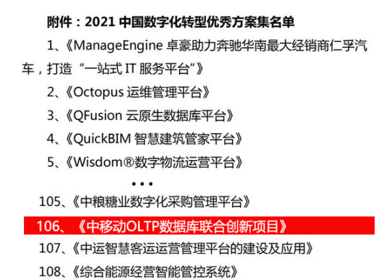 万里数据库中移动OLTP数据库联合创新项目成功入选《2021中国数字化转型优秀方案集》,为助推中国数字化转型及国产化实践发挥标了杆引领作用。