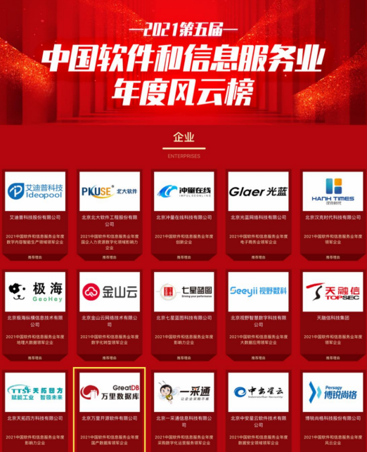 日前,“2021第五届中国软件和信息服务业年度风云榜”评选结果正式公布。风云榜推优榜单中,万里数据库荣获“2021中国软件和信息服务业年度国产数据库领军企业“。同时,中移动OLTP数据库联合创新项目作为优秀项目案例入选《2021中国数字化转型优秀方案集》。