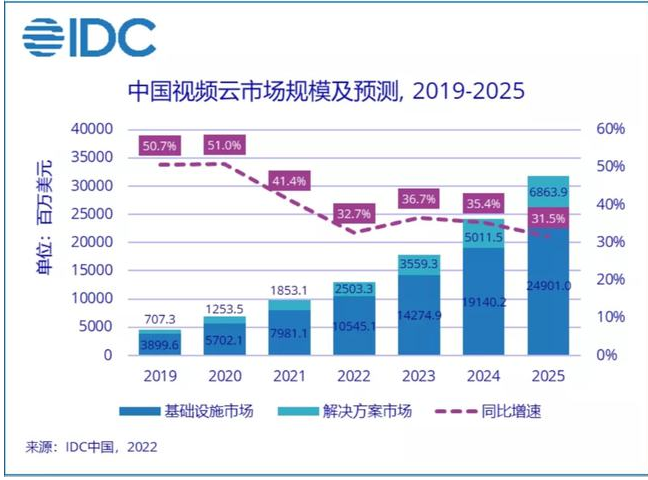 这是一个产业数字化、数字产业化的时代,无处不在的云,也让音视频技术打开了更大的数字新视界。IDC预测显示,中国视频云市场依然会保持较高速的增长,预计2025年将达到318亿美元。