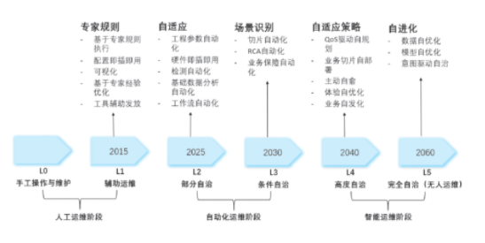 在综合各方观点的基础上,笔者认为智能运维的发展分3个大阶段6个小阶段。分别是人工运维、自动化运维、智能运维3大阶段。其智能等级参考TM Forum自动驾驶网络从L0-L5逐级递增,如图1所示。
