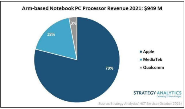 另根据Strategy Analytics早前所发布的报告显示,预计2021年,Arm笔记本电脑处理器的收益将增长超过三倍。苹果、联发科和高通将在2021年占据Arm笔记本电脑处理器市场的最大收益份额。从出货量来看,基于Arm的笔记本电脑处理器出货量将在2021年增长两倍以上,占笔记本电脑处理器总出货量的10%以上。其中,苹果在M1的推动下,将在2021年占据近80%的收益份额。