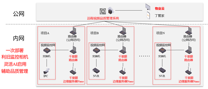 针对物业品质管理人力差旅、差旅成本、标准化执行的普遍现象,千丁智能与物业同行共同探索如何利用技术落实社区精益化管理、社区品质标准化管理,并推出千丁“远程视频品质管理系统”(别称:千里眼),基于该物业以摄像头利旧的方式,建立强大的AI视觉感知系统,结合工单系统,辅助品质管理升级,赋能管理人员。